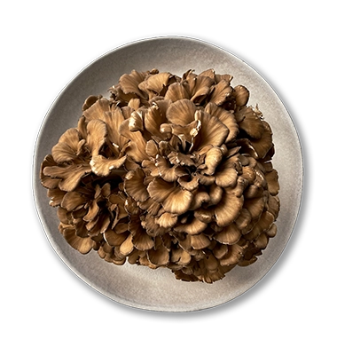Feathery, aromatic, and naturally complex. Maitake mushrooms grow in layered clusters with a strong earthy scent and a rich, woodsy character that stands out in gourmet kitchens. Their unique shape and bold flavor make them visually and culinarily special.