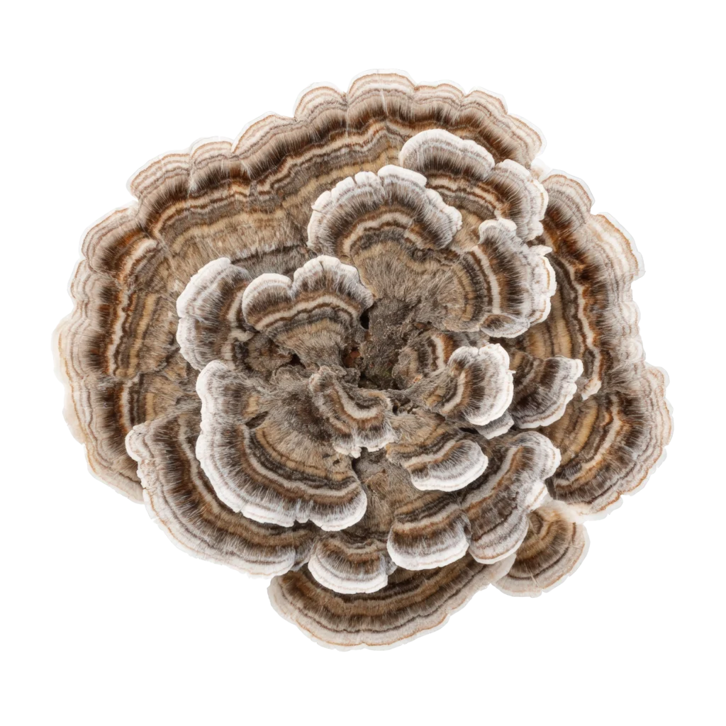 Thin, colorful, and packed with tradition. Turkey Tail is a tough, woody mushroom recognized by its striking concentric bands that resemble a turkey’s tail. While not eaten like culinary mushrooms, it’s highly valued in wellness practices around the world.